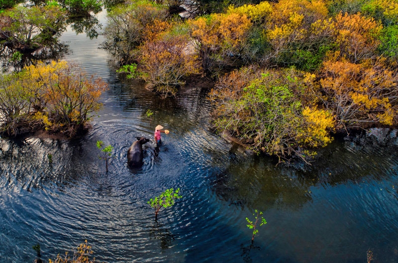 Vào mùa thu cây chá ra hoa vàng, cùng với lá cũng đổi sang màu vàng trong hai tuần sau đó lá chuyển sang màu đỏ. Từng đám hoa lá với sắc vàng cam đỏ xen lẫn màu xanh của dừa nước, bóng nước mây trời, những rào chắn bắt tôm cá cùng những chiếc thuyền của bà con nông dân hòa quện tạo nên một bức tranh tuyệt đẹp.