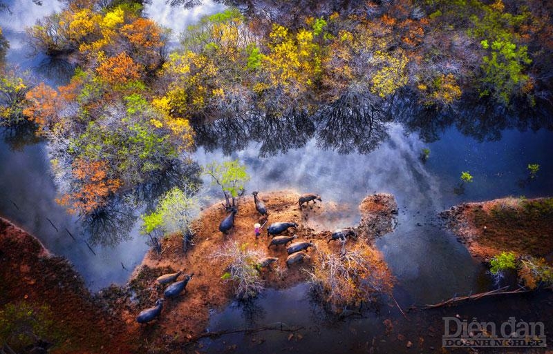 Từng đám hoa lá với sắc vàng cam đỏ xen lẫn màu xanh của dừa nước, bóng nước mây trời...